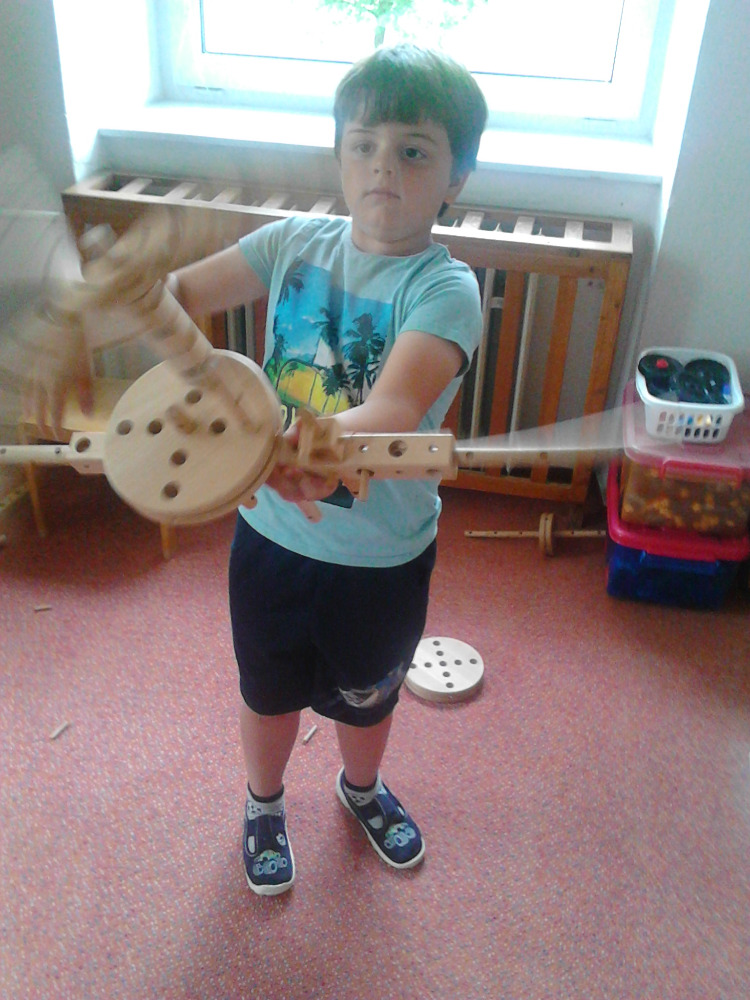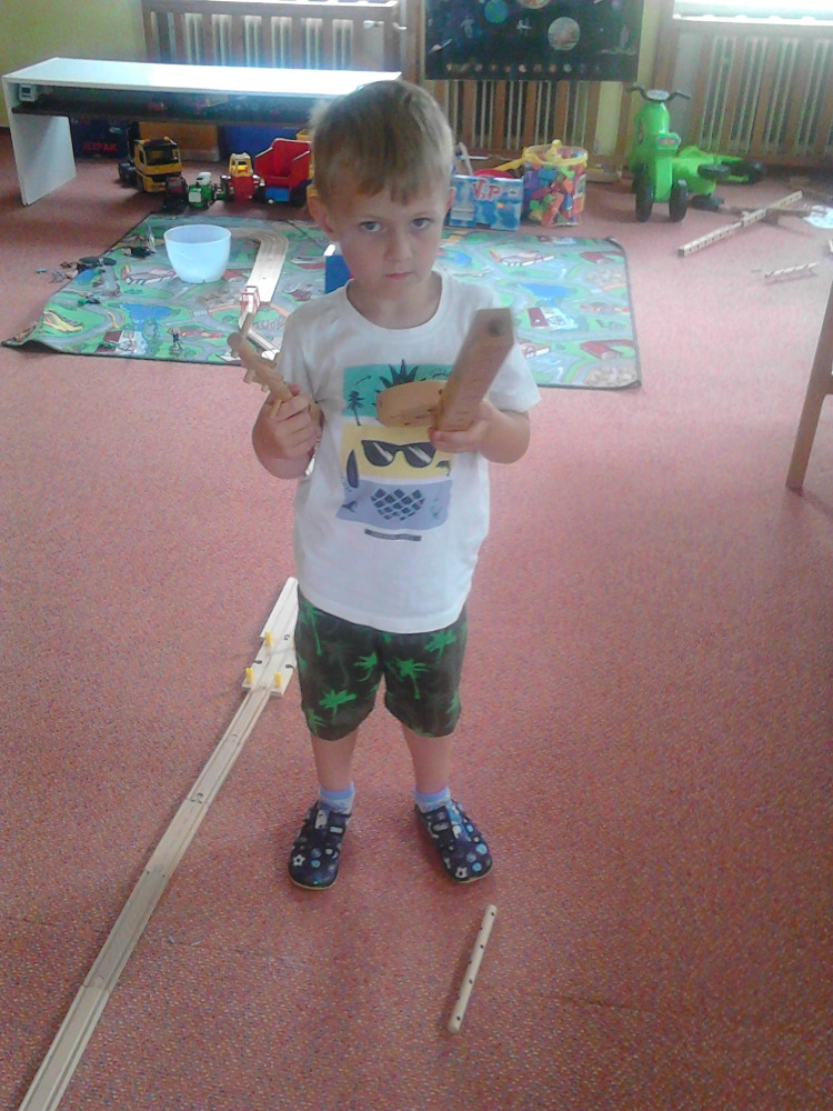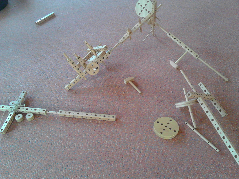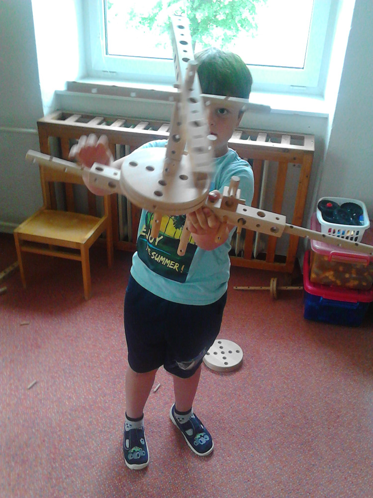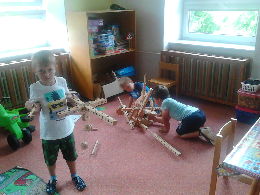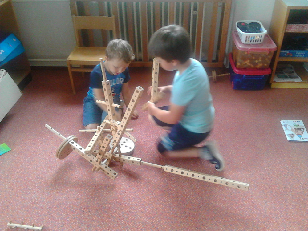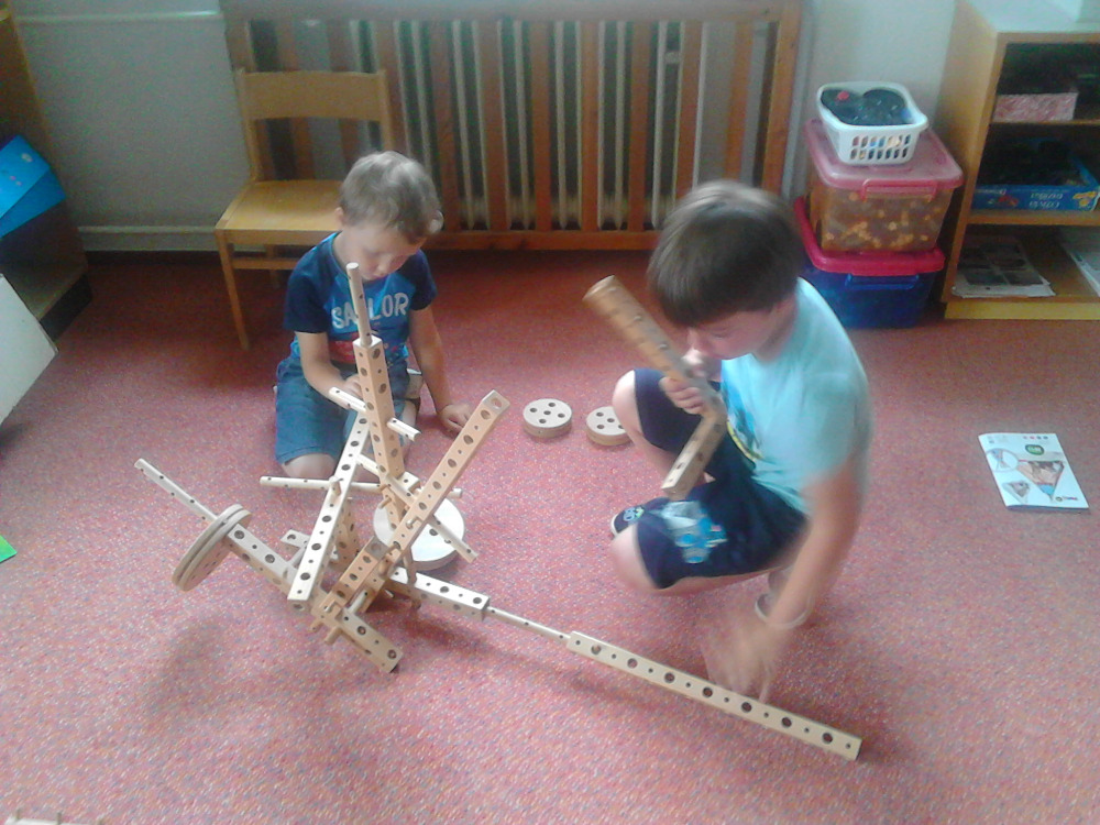 Naši kluci zkoušejí, které díly do sebe zapadají, kdy se co točí a jak obří věc dokážou sestavit. Stavebnice se mění na sekačku, meč, letadlo, střílečku, činky nebo cokoli jiného, co kluci právě potřebují do hry podle své fantazie.
